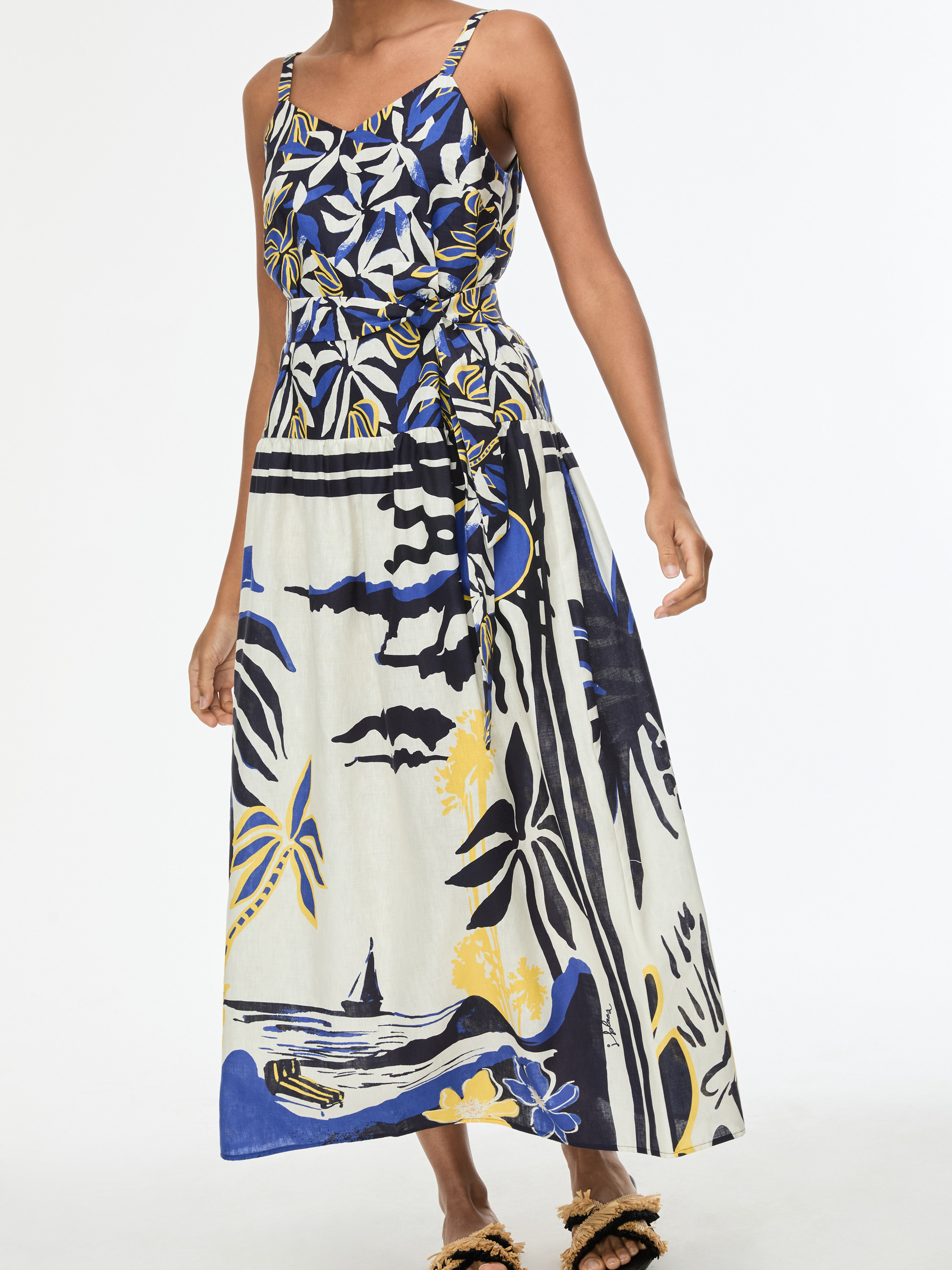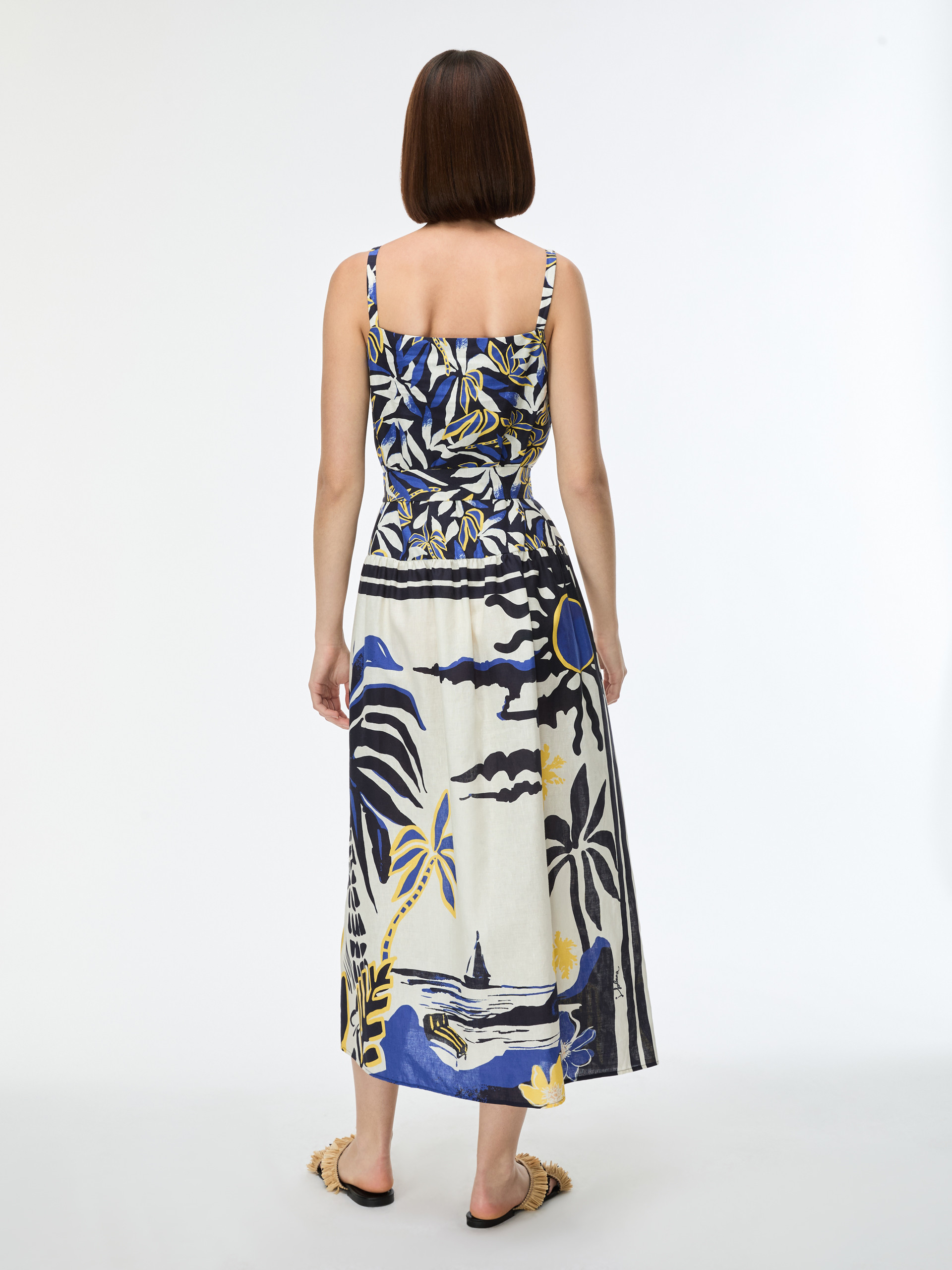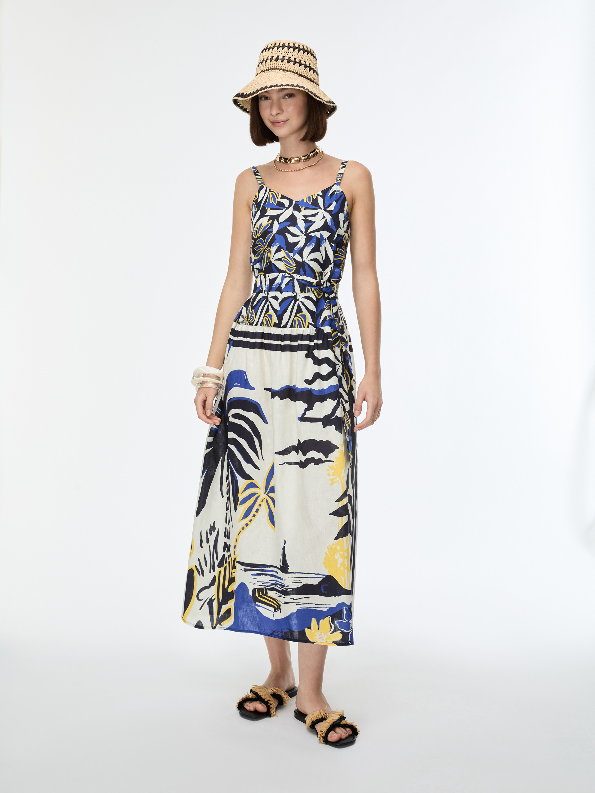 • Long dress in printed linen and cotton-blend fabric